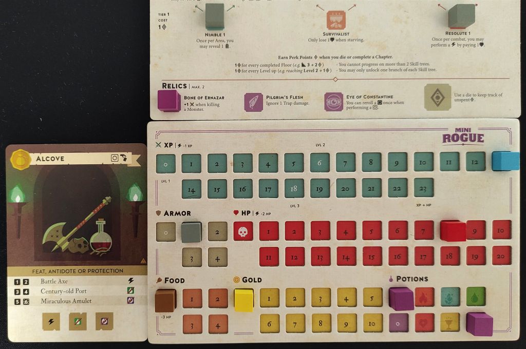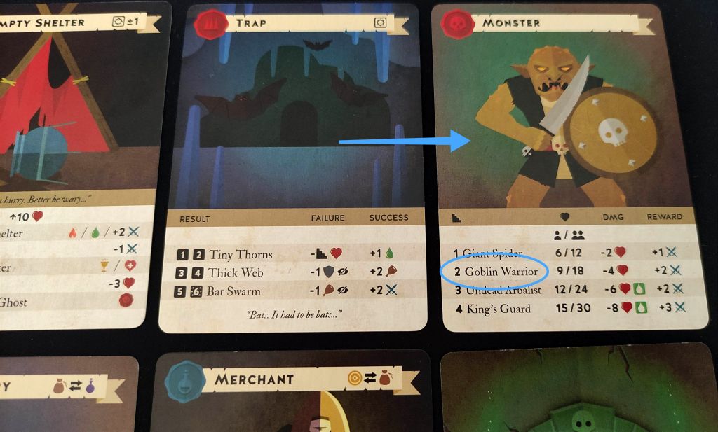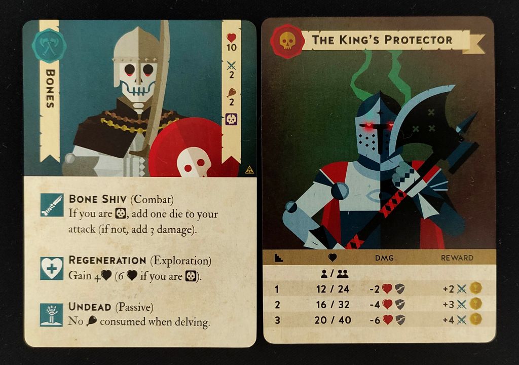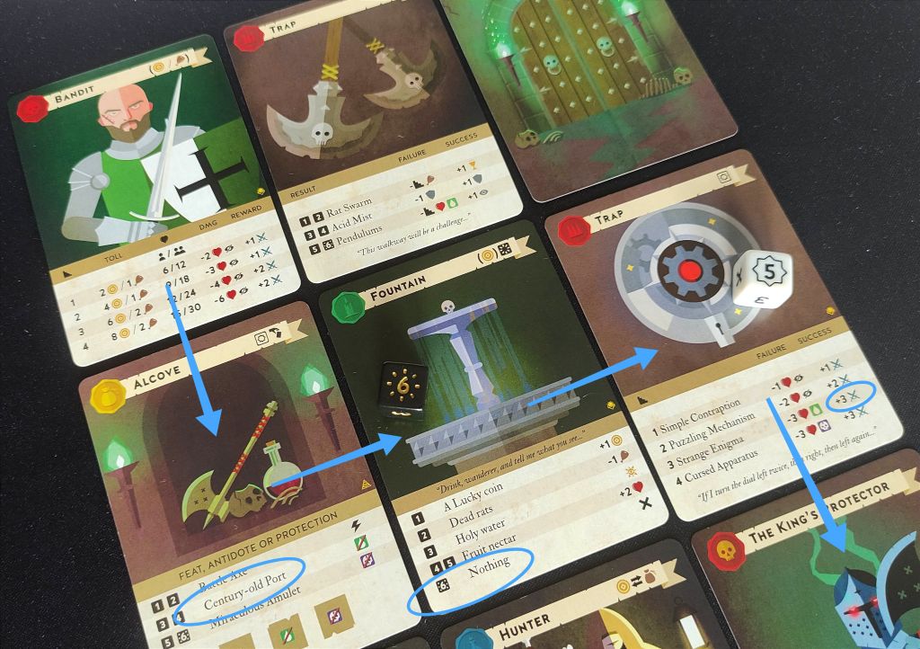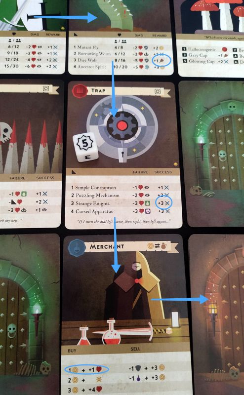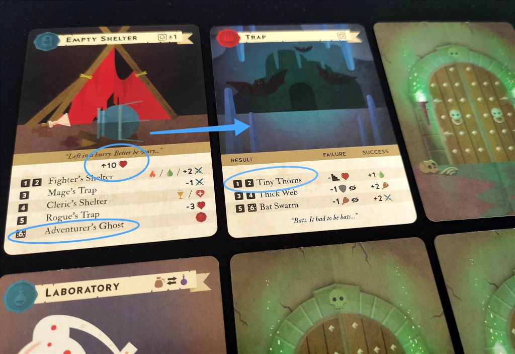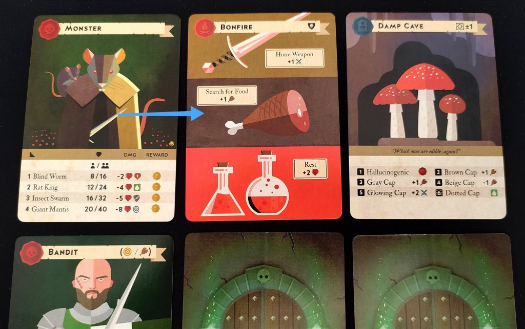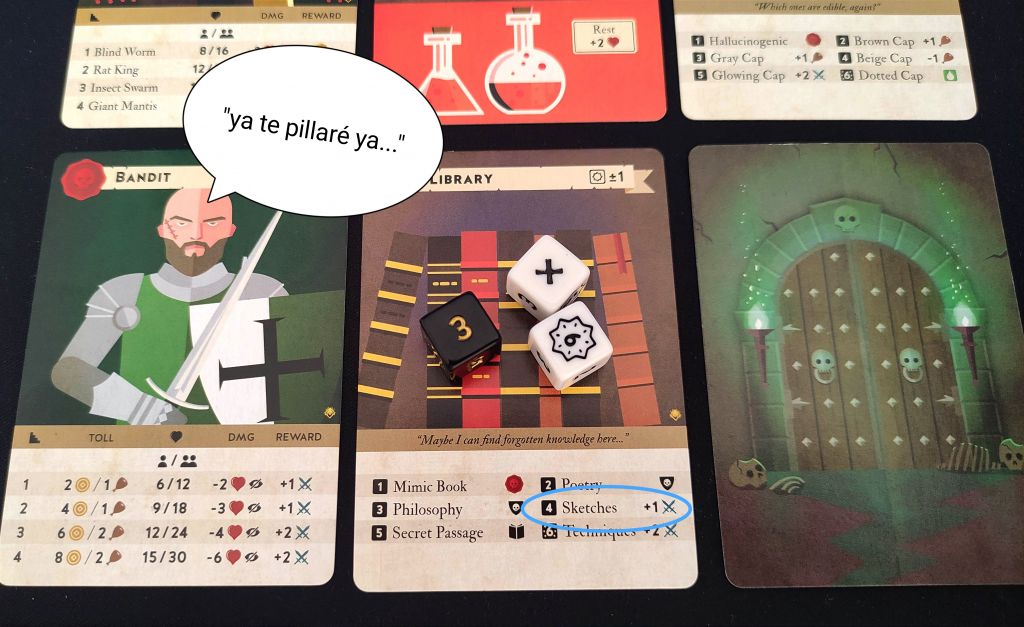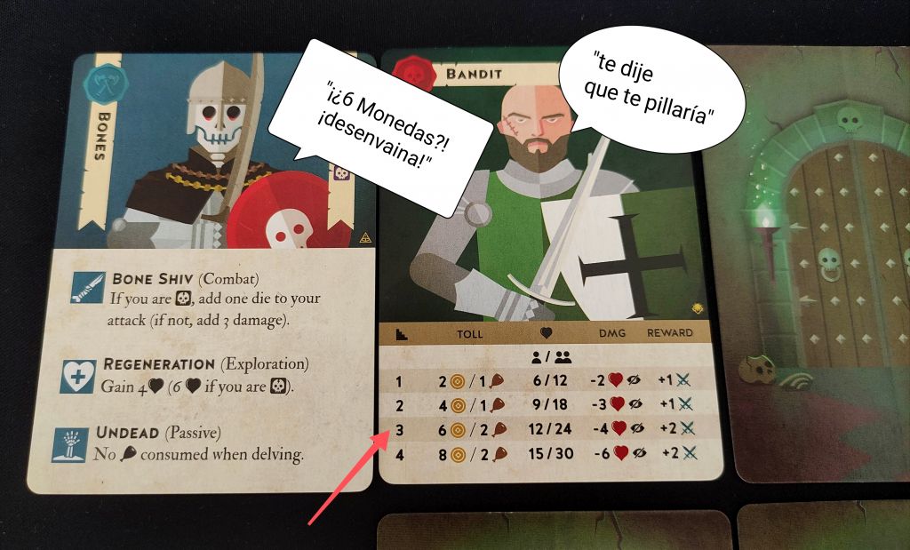 Me explico: la Cueva Húmeda (Damp Cave) la descubro por la habilidad Ágil (que no es que le pegue mucho el nombre pero bueno). Tenía pensado ir hacia abajo ya que podría evitar el combate con el Bandido dándole la moneda que acabo de obtener (viene indicada esa posibilidad en la parte superior izquierda de su carta). Pero es que a mi derecha tengo una Hoguera, con la que renuevo la posibilidad de usar habilidades (el Puñal de Hueso y Regeneración, que lo de Ágil/Decidido va por otro lado). Y lo que es casi más importante, elijo la opción de la Hoguera de ganar 2 de vida que me viene de perlas. Así que para allí que voy, esperando que la habitación debajo de la Hoguera me depare algo no muy grave.