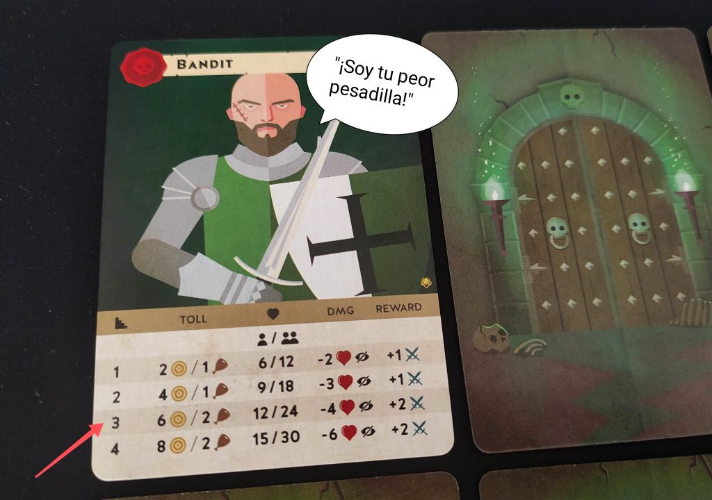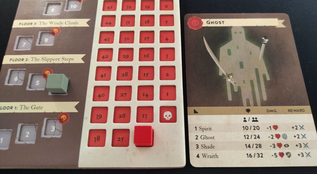 Como estoy en el piso 2, el Fantasma me hará 2 de daño (1 si lo bloqueo con la armadura). Además está ese simbolito de espiral al lado de su daño. Significa ‘Debilidad’, que me resta 1 de Experiencia