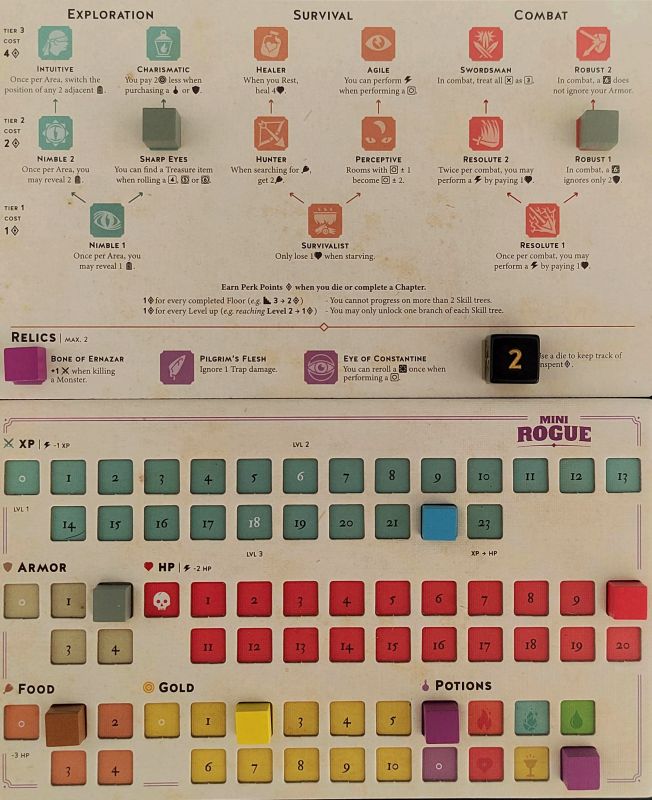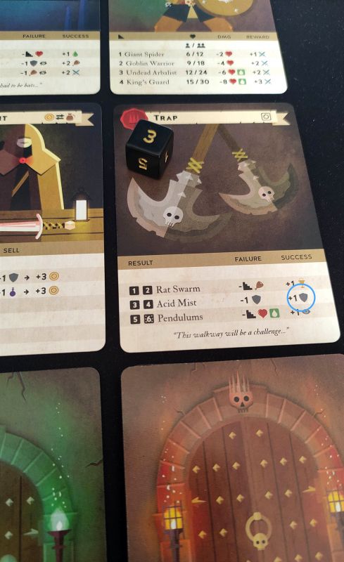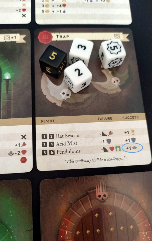 Me haría 2 de daño porque tengo 2 de Armadura. A no ser, claro, que saque un 6; entonces su ataque sería penetrante y justo me mataría. Al menos el envenenamiento me lo quitaría con el objeto que llevo del capítulo anterior, y después del combate podría usar la habilidad de Regeneración y obtener 4 de vida.