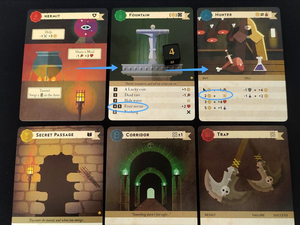 Antes de visitar al Cazador me adelanto para ver a dónde me lleva ese camino (habilidad de Ágil). Aunque hay una trampa decido asumir el riesgo, y le compro al cazador una pócima para eliminar la Maldición (-2 Monedas, Maldición)