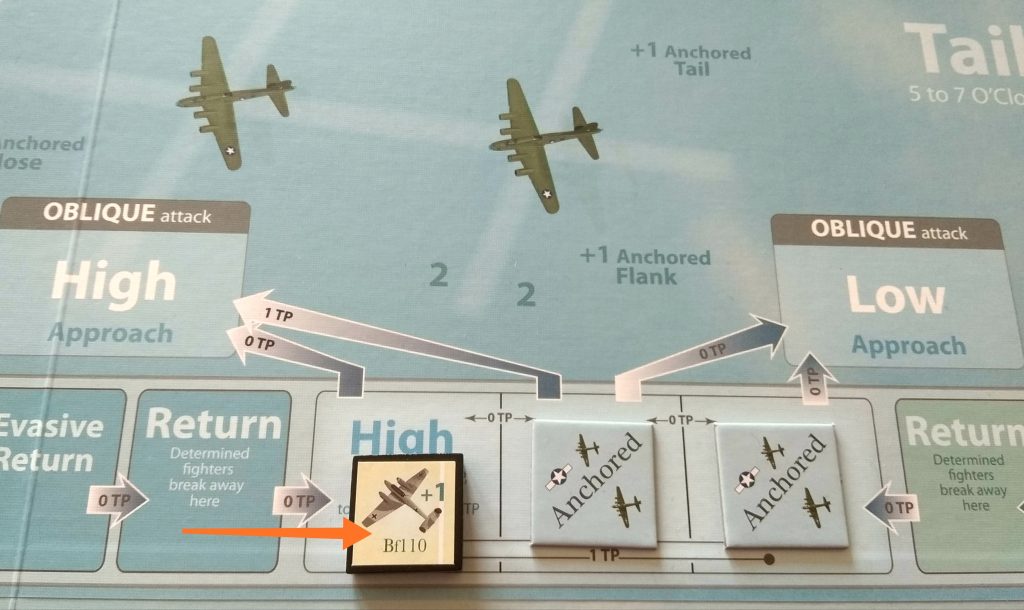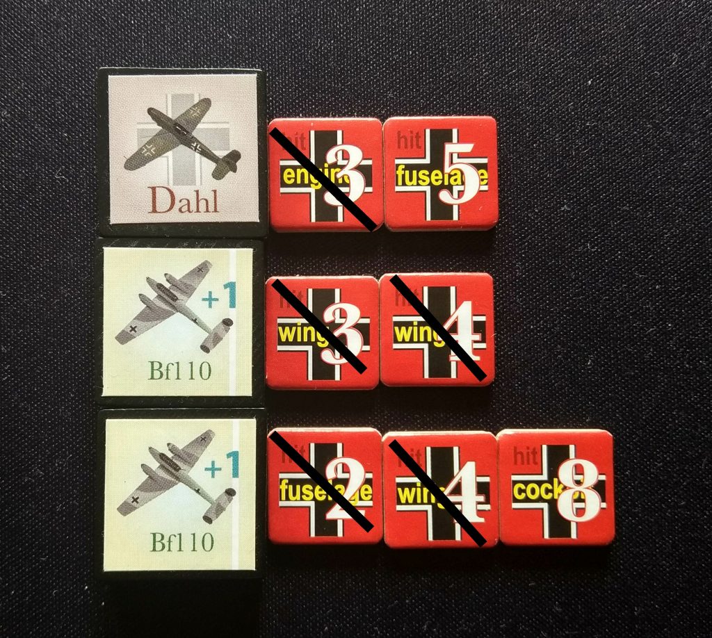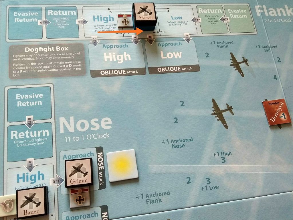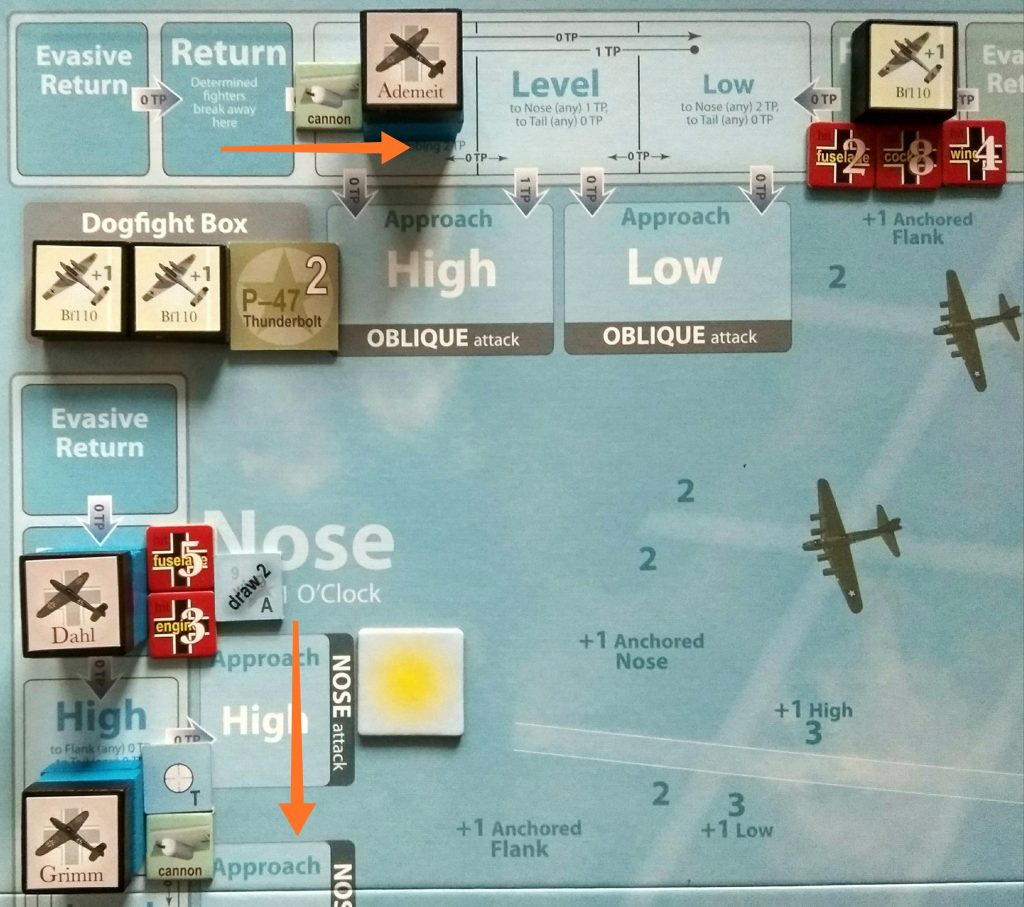 Los cazas alemanes se mueven, dando la vuelta para encarar un nuevo ataque al siguiente turno. Pero no todos, ya que los aviones dañados no pueden moverse, a la espera de determinar si el daño es leve o grave.