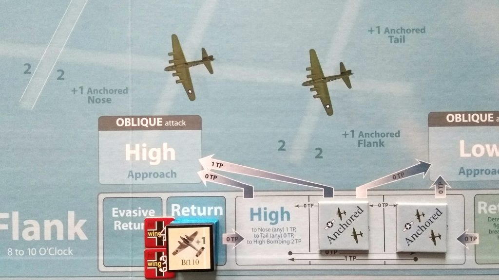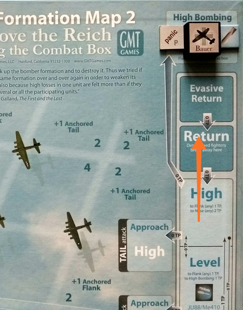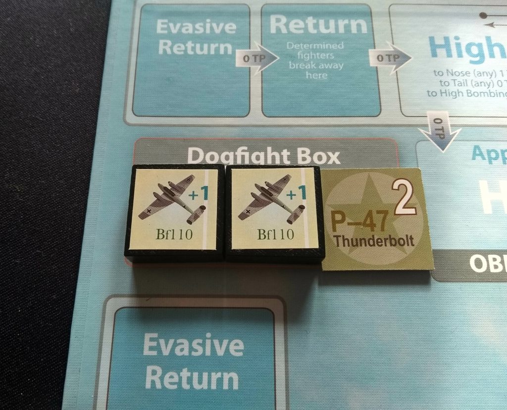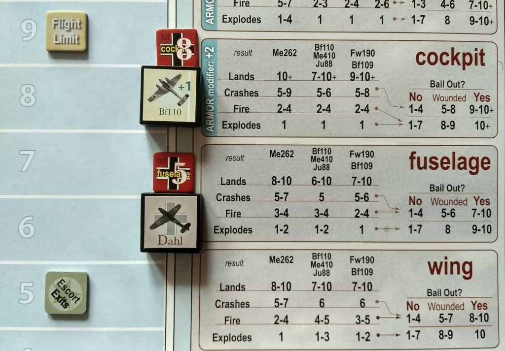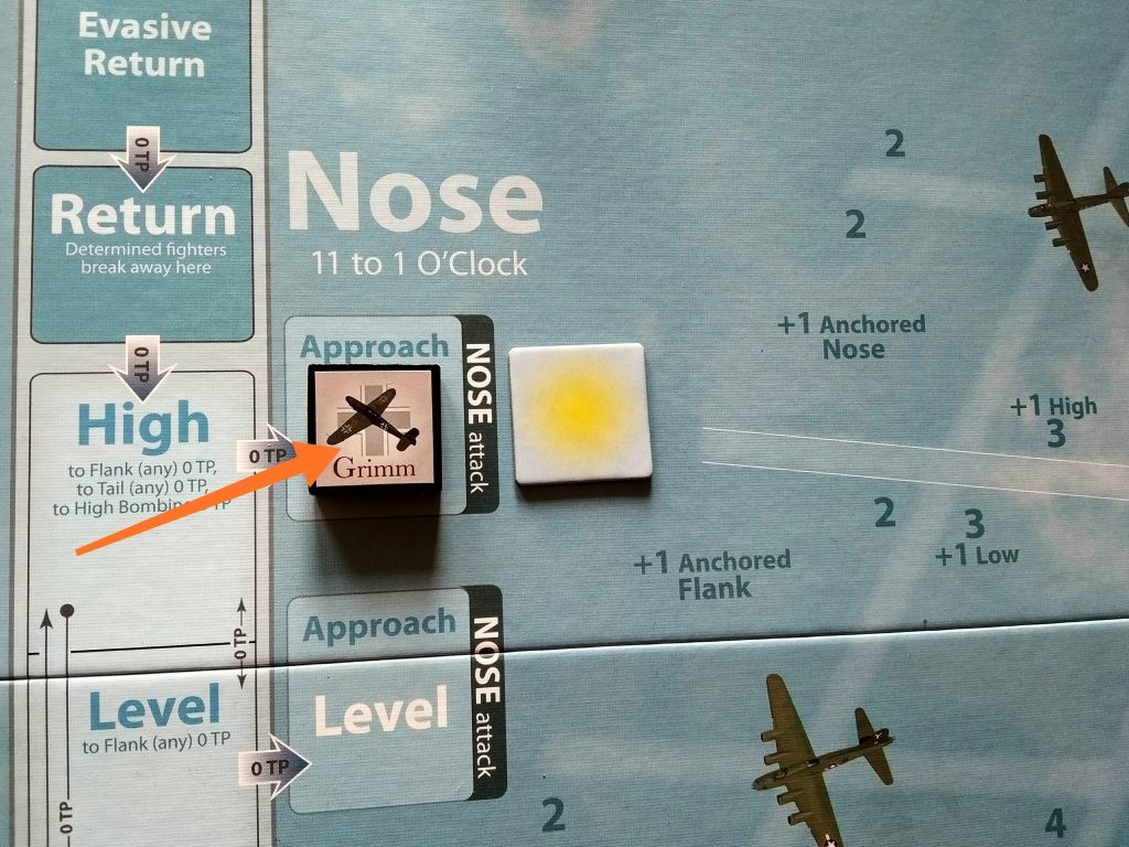 Los cazas alemanes se mueven, dando la vuelta para encarar un nuevo ataque al siguiente turno. Pero no todos, ya que los aviones dañados no pueden moverse, a la espera de determinar si el daño es leve o grave.
