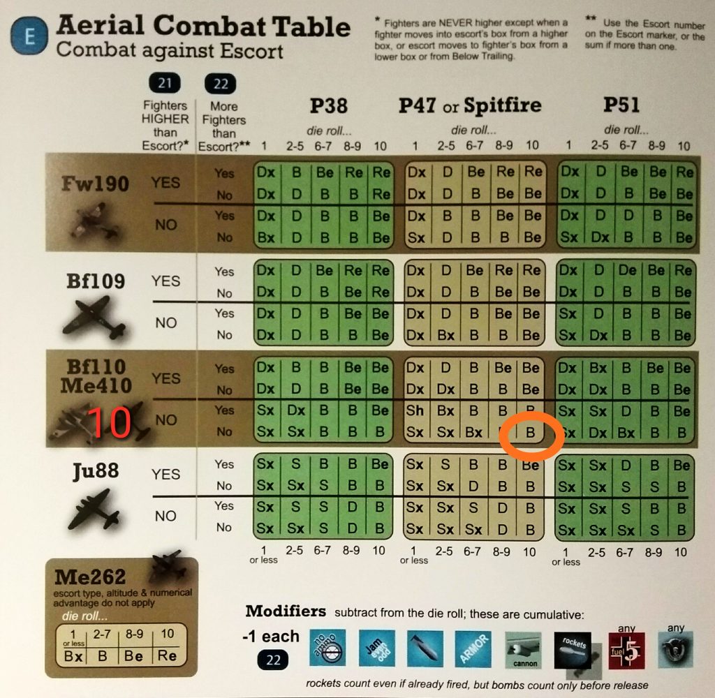 Ha aparecido una escolta enemiga en el espacio donde haya más cazas. Como en todos hay solamente uno, elijo yo, y decido que sea donde el Bf110, que de caer es sustituible en la siguiente misión.